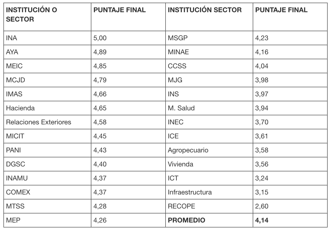 Dentro de este contexto cabe destacar que cuatro instituciones (MEIC, Ministerio de Hacienda, MINAE, MSGP) y un sector (Infraestructura) presentaron los mayores progresos con respecto a su calificación obtenida en el año 2000. De estos el MEIC creció 2,05, el Ministerio de Hacienda 1,17, MINAE 0,86 y MSGP 0,85, mientras que el Sector Infraestructura creció 0,99.